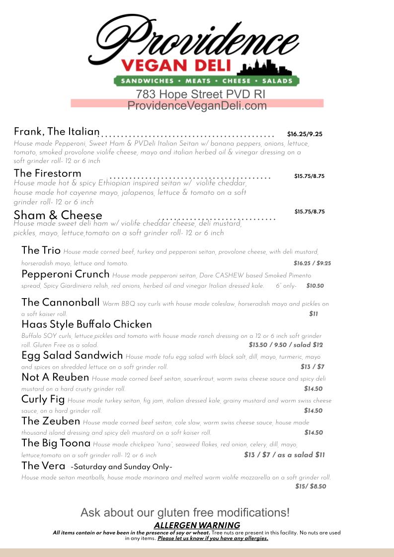 Sun 12-5/ Mon Closed/ Tu 11-5/ Wed Thur Fri 11-7/Sat 12-7 Order via our website for free pickup orders or use DoorDash for delivery. Please be advised that ordering pickup via our website you will not be charged any fees or markup. If you order pickup on DoorDash you will be charged more. We are located at 783 Hope Street Providence RI within the same building as Like No Udder Vegan Ice Cream. All items are vegan and house made when possible.