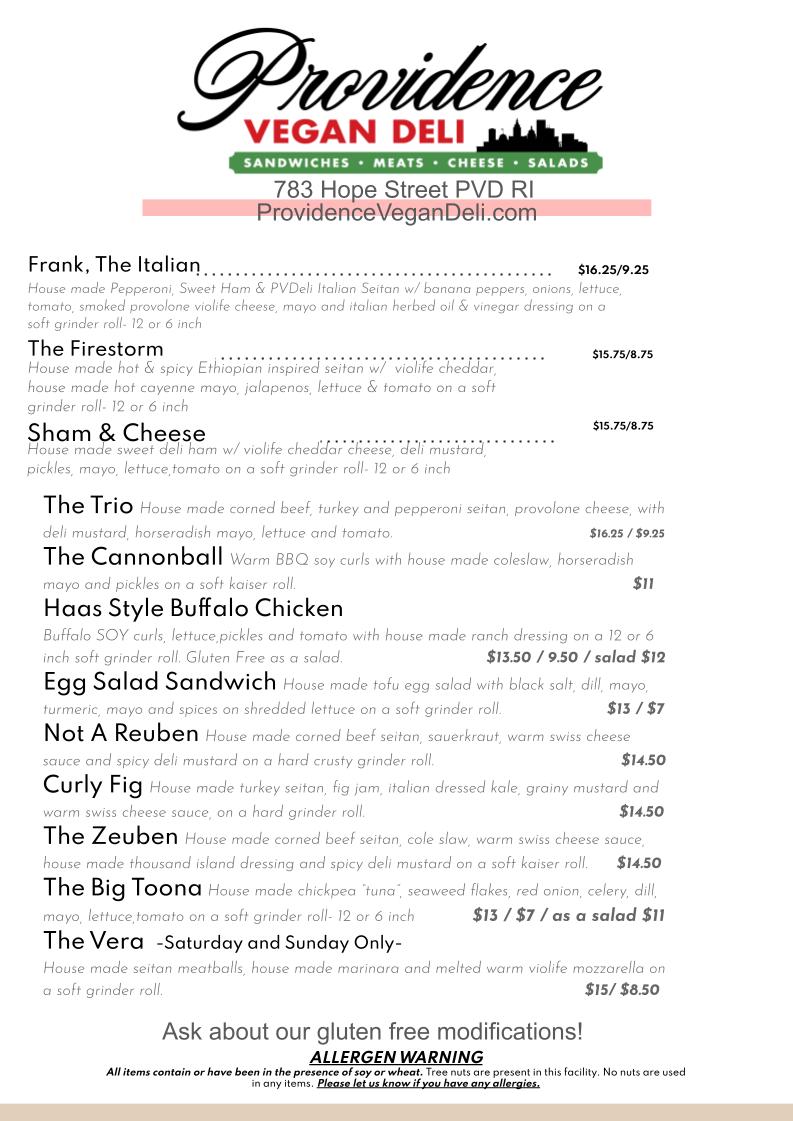 PVDeli and Like No Udder are separate businesses under their own management, hours and routines. PVDeli never speaks for Like No Udder in terms of hours or closures so if you see we are closed a certain day, please check LNU website for their hours and operations. Please do not call Like No Udder for information about the deli. Everything you need to know can be found on this website or simply contact PVDeli via email for any questions ProvidenceVeganDeli@gmail.com