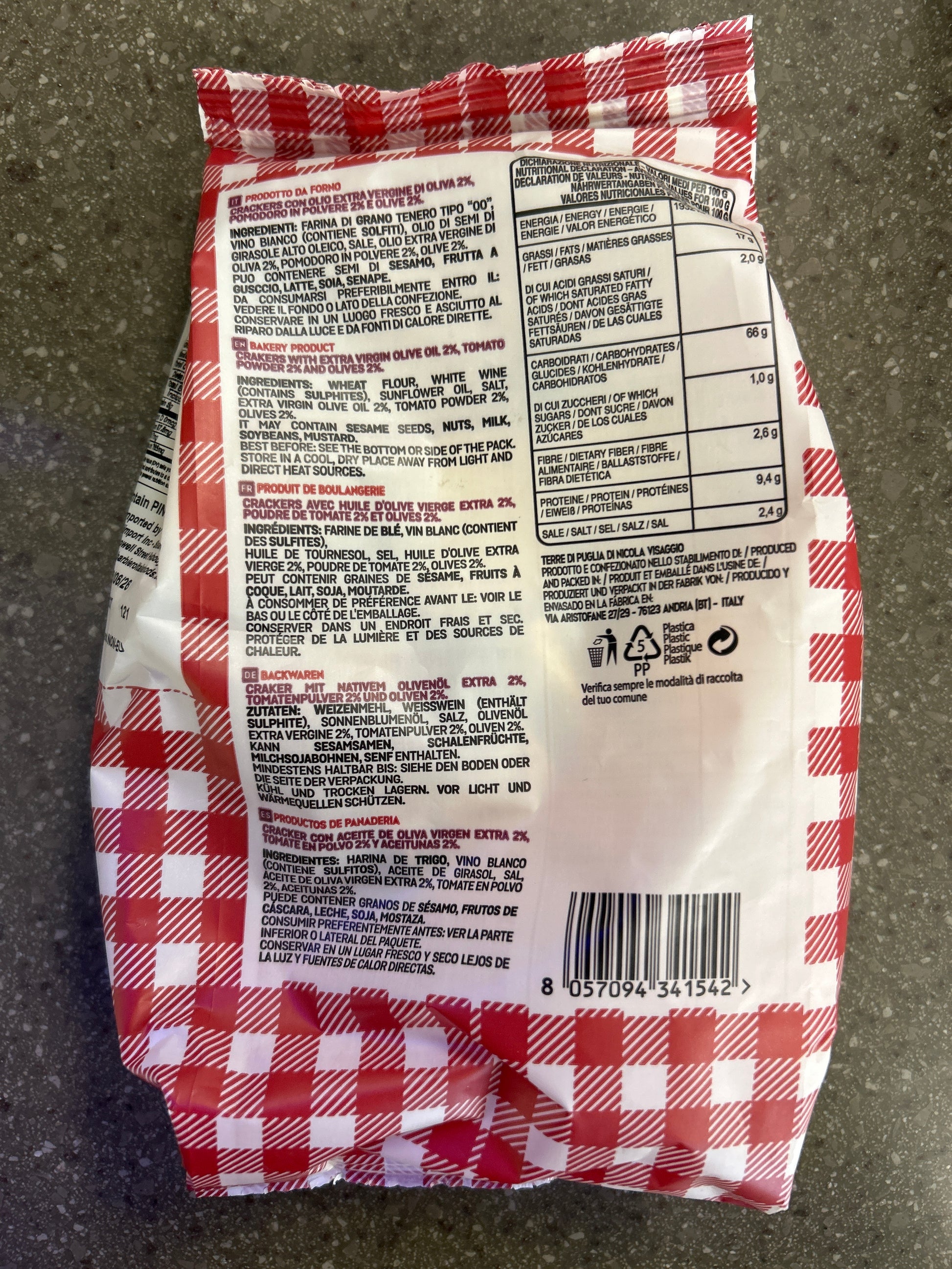 7.1 ounce bag of italian tomato & olive crackers. Contains wheat.
