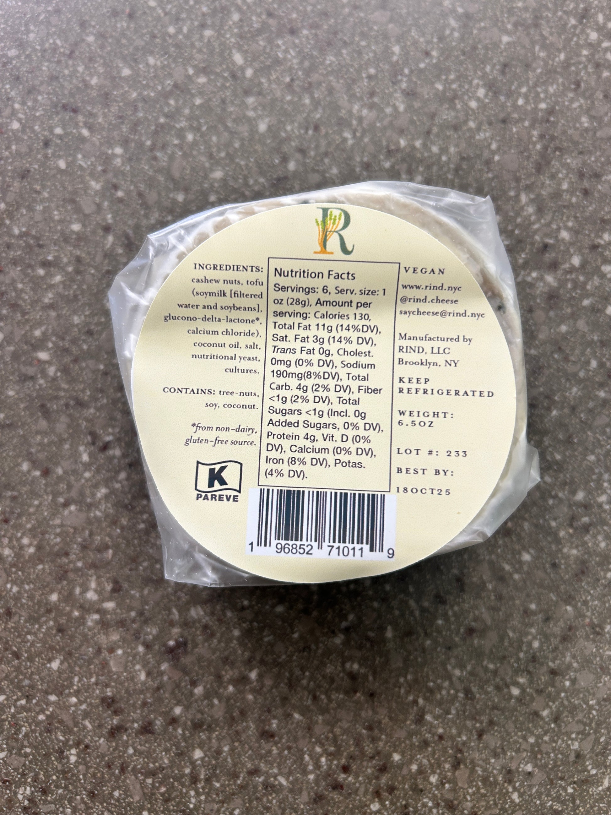 French style soft cheese wheel. 6.5 ounces. Contains Cashew.