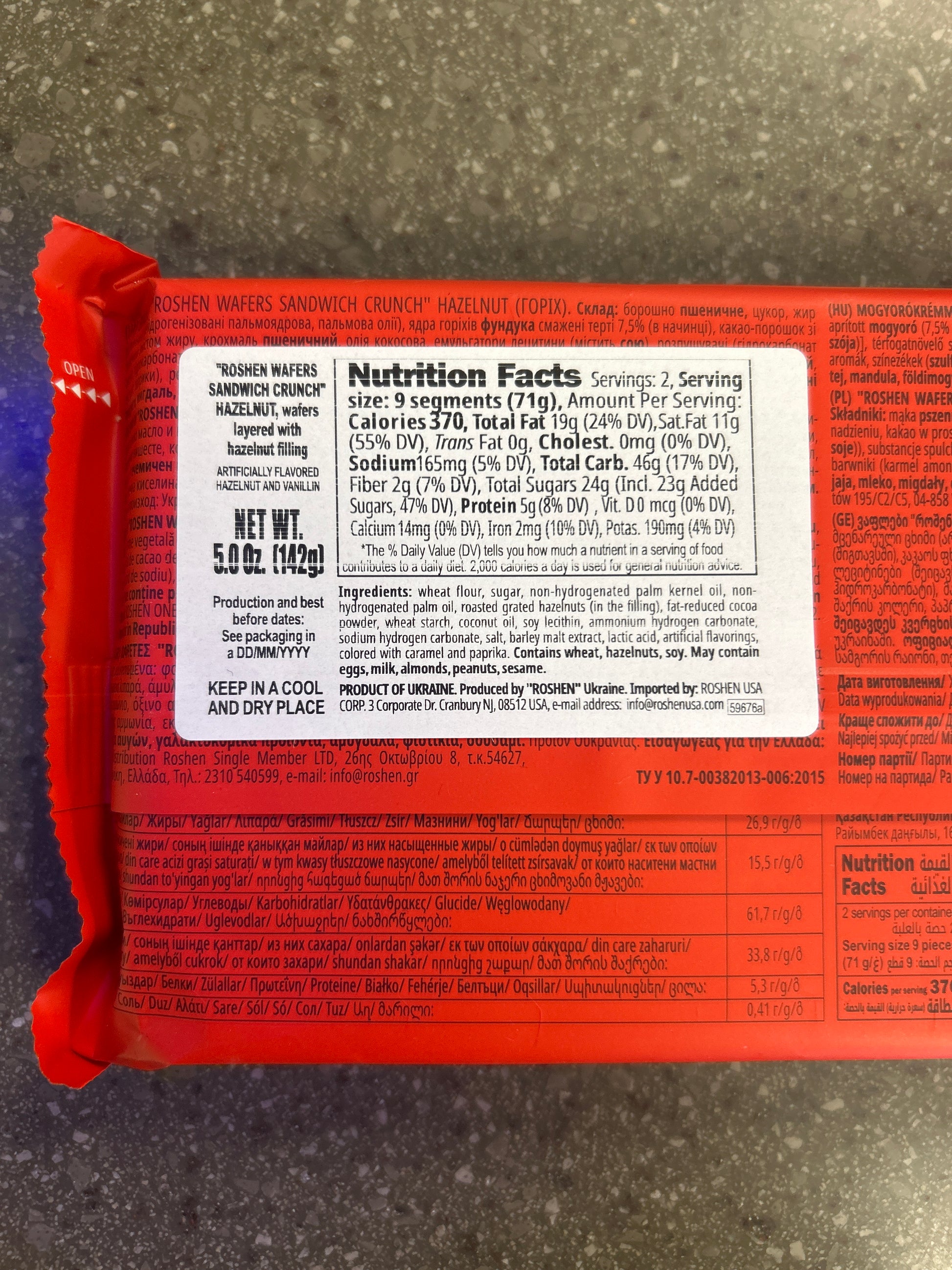 142 gram package of vegan hazelnut extra crunchy wafers. Contains soy and hazelnut